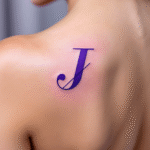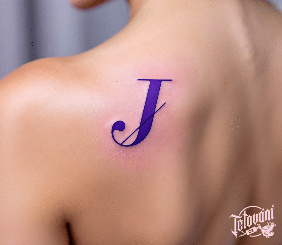 Tetování nápis, fialové písmeno J na lopatku