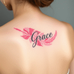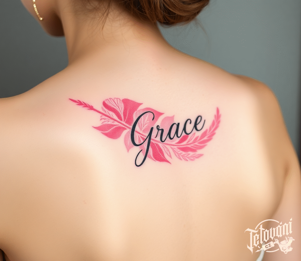 Tetování nápis Grace, pírko s nápisem na zádech