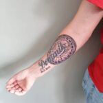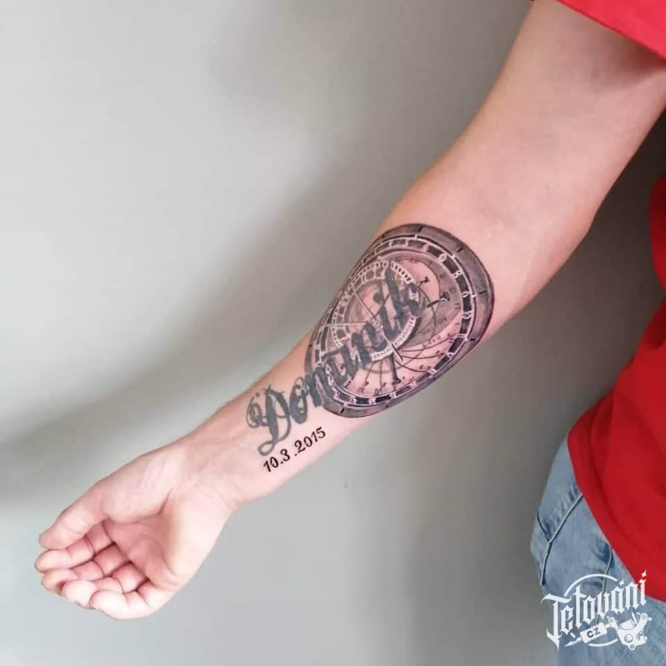 Tetování nápis, jméno a datum, hodiny na předloktí