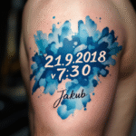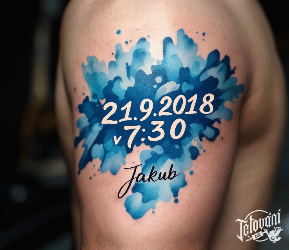 Tetování nápis jméno Jakub, hodiny a narození dítěte na rameno