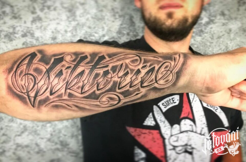 Tetování nápis, jméno, symboly rodiny na předloktí