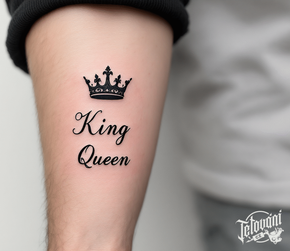 Tetování nápis king, gueen, koruna na předloktí