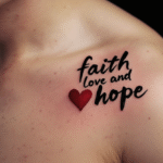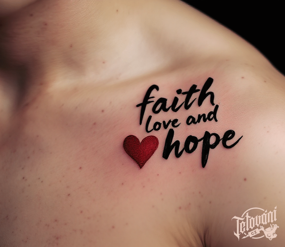 Tetování nápis, láska, víra a naděje pod klíční kost