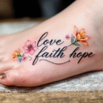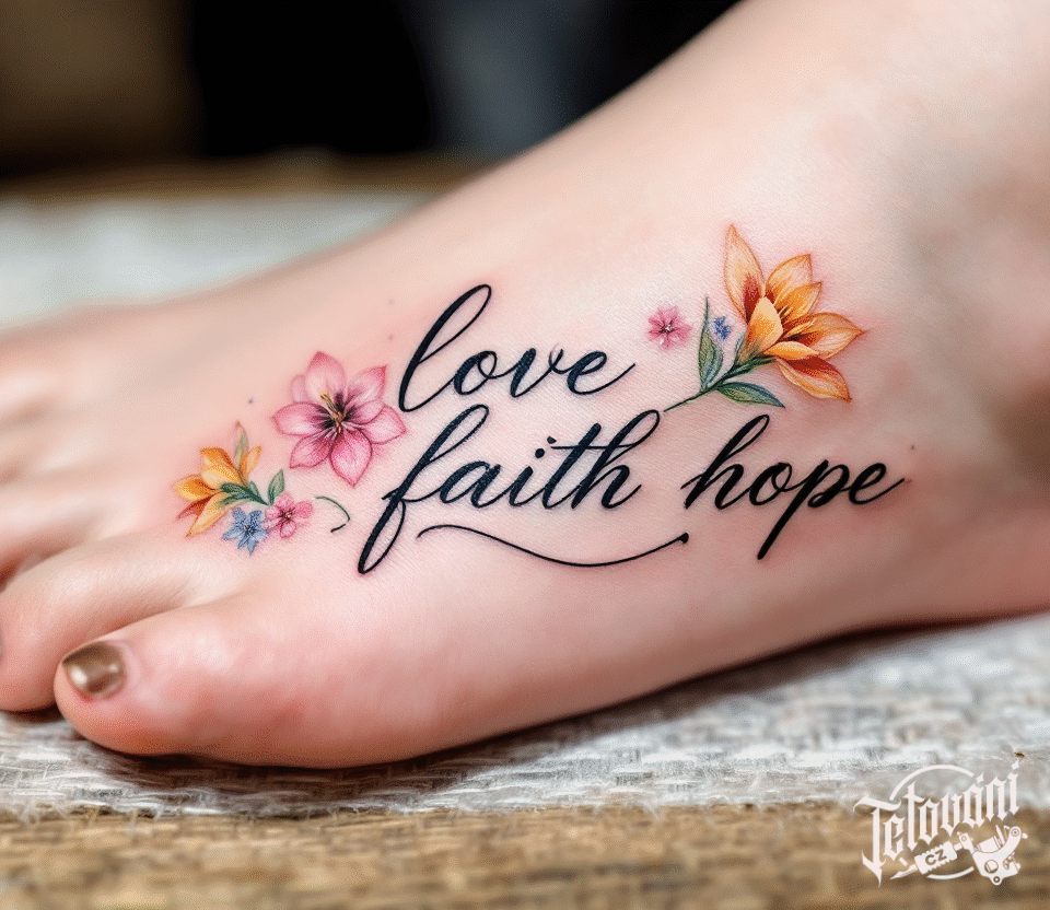 Tetování nápis, láska, víra a naděje s květy na nárt