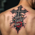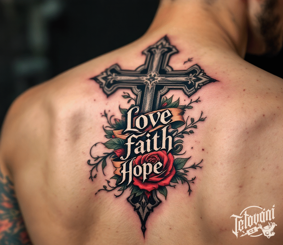 Tetování nápis, láska, víra, naděje, kříž na záda