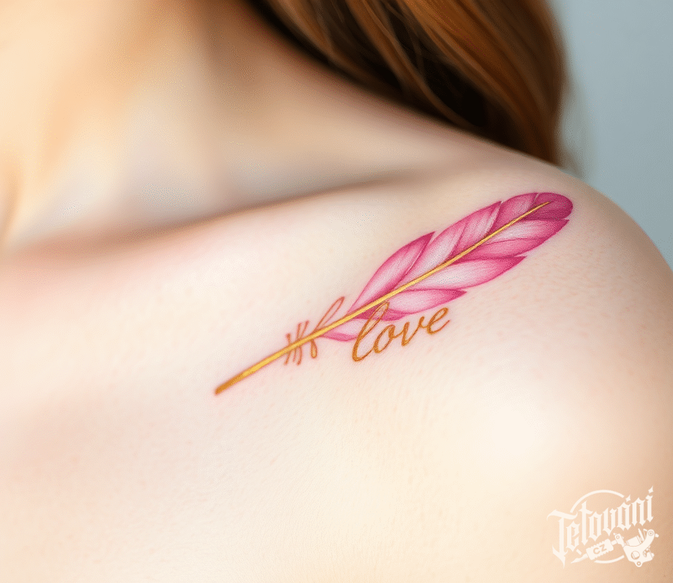 Tetování nápis Love pírko pod klíční kost