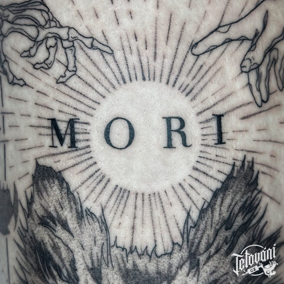 Tetování nápis memento mori, ruce, symbol života na rameno