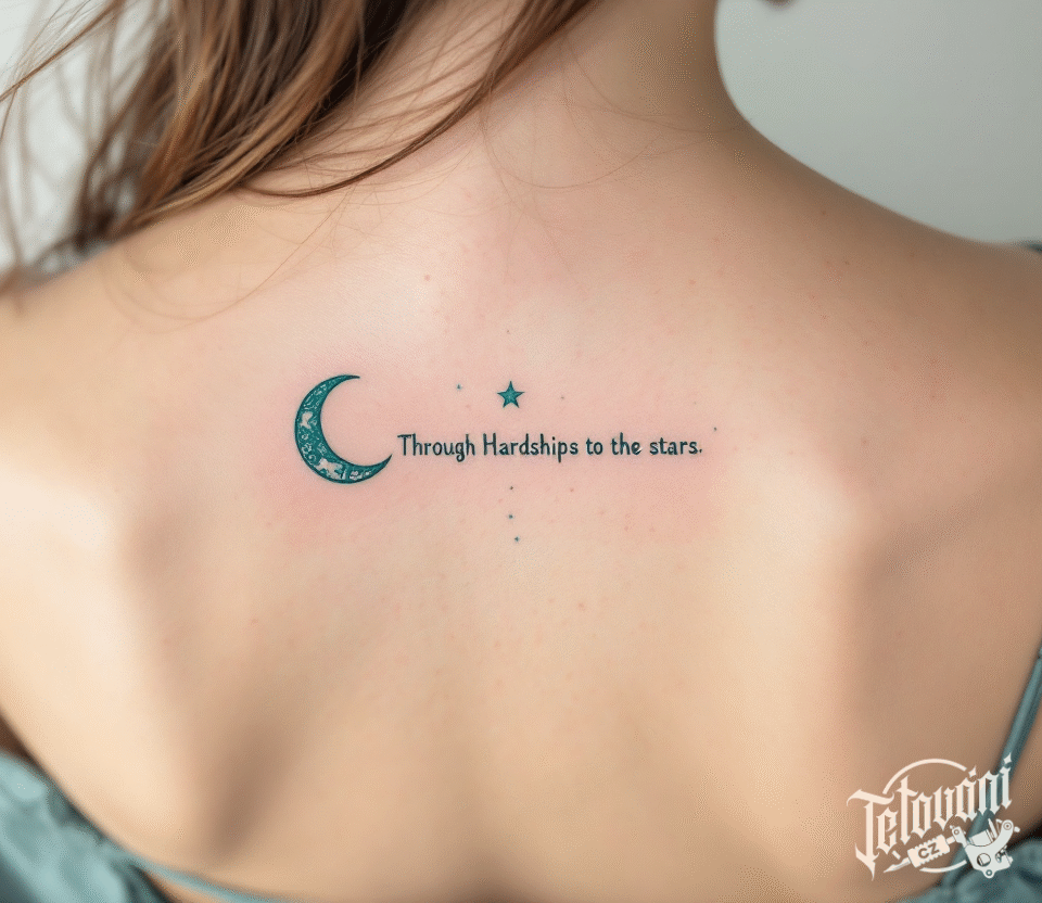 Tetování nápis, motivační motto přes překážky ke hvězdám mezi lopatky