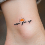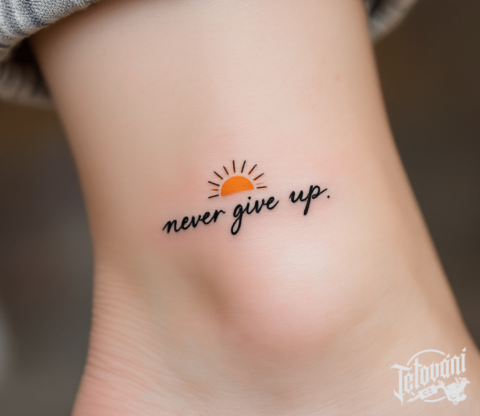 Tetování nápis, motto, never give up se sluncem na kotník