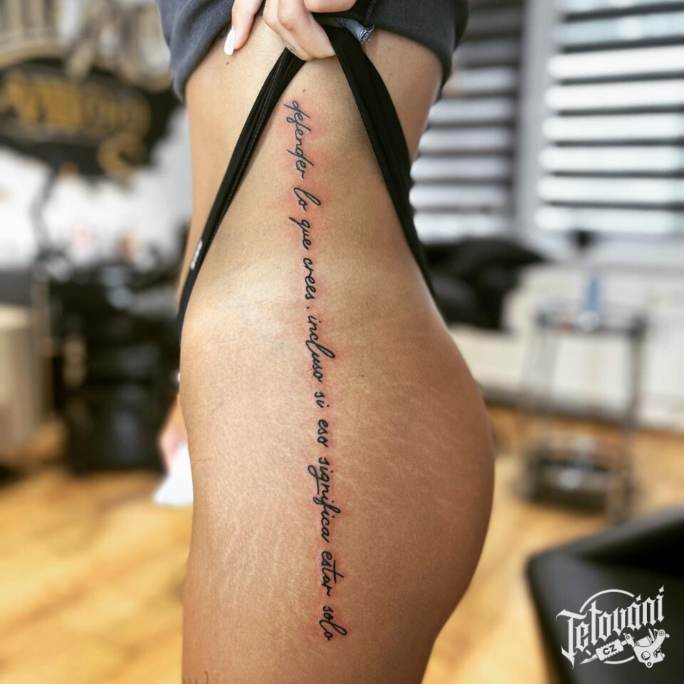 Tetování nápis na boku stehna