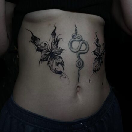Tetování nápis na předloktí a zvíře motýl na břicho