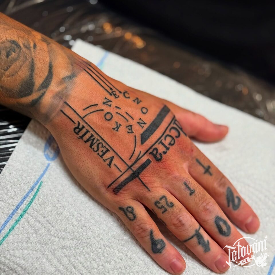 Tetování nápis, nekonečno a čáry na hřbetu ruky
