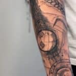 Tetování nápis panny znamení zvěrokruhu, planeta, čáry a květiny na předloktí