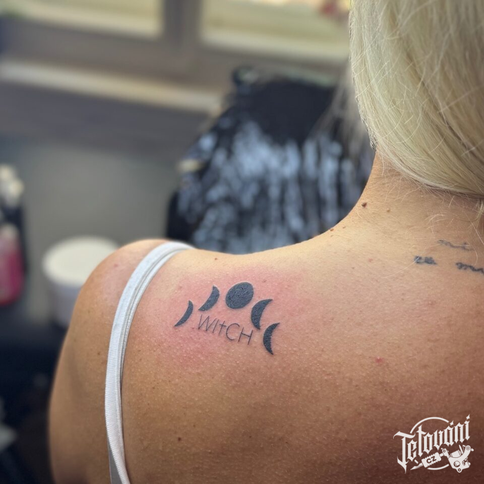 Tetování nápis, písmena a měsíc na záda