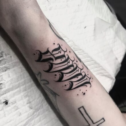 Tetování nápis, písmena, symbol na holeň