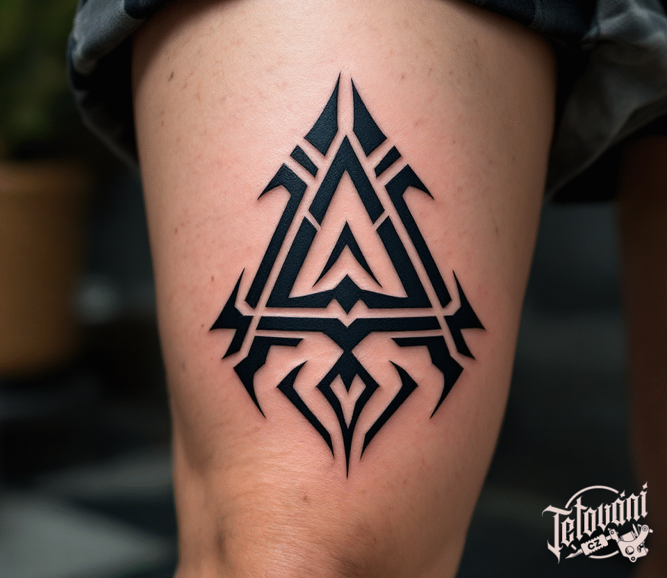 Tetování nápis, písmeno A v mayorském stylu na stehno