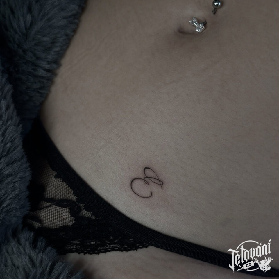 Tetování nápis, písmeno E na břichu