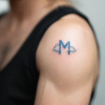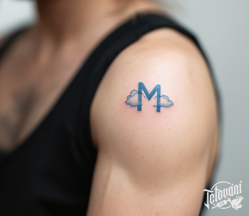 Tetování nápis, písmeno M s mrakem na rameno