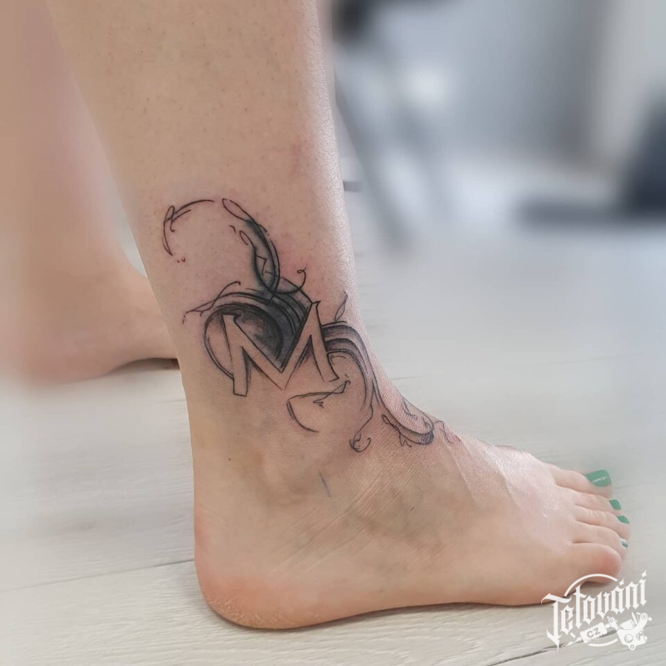 Tetování nápis, písmeno na kotníku