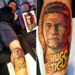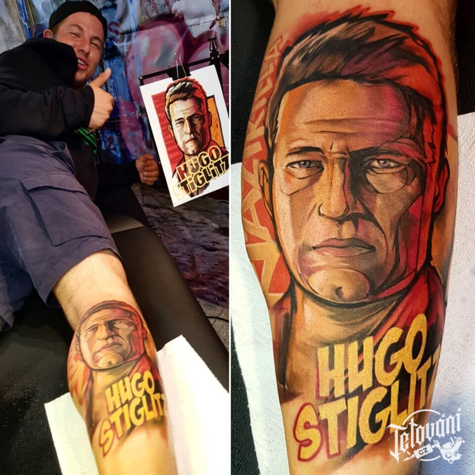 Tetování nápis, portrét osobnosti Hugo Stiglitt na předloktí
