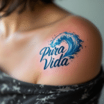 Tetování nápis pura vida s vlnou na rameno