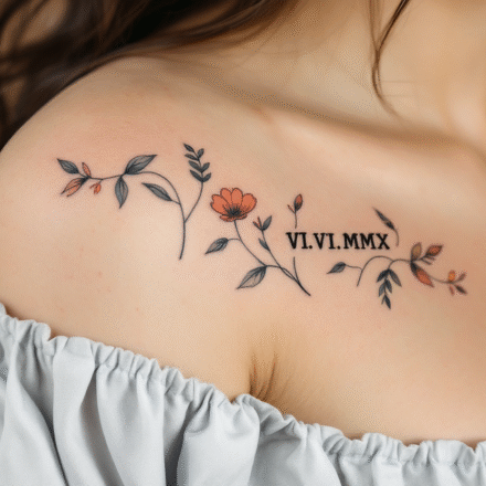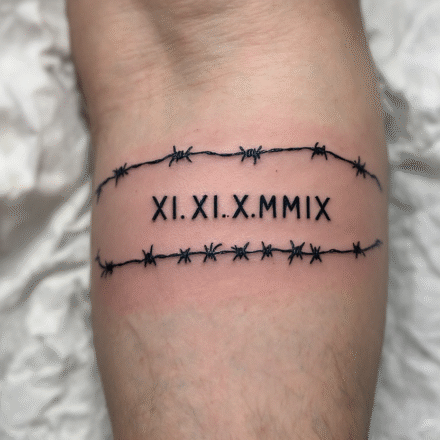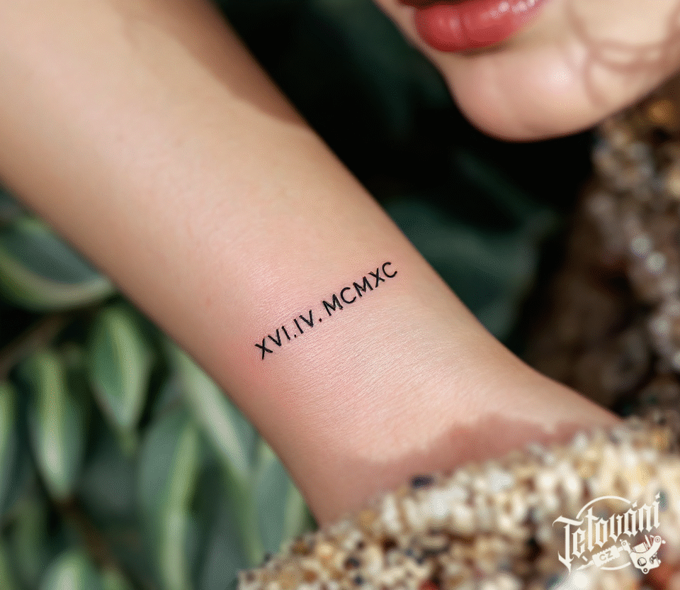 Tetování nápis, římská čísla, datum, písmena na předloktí