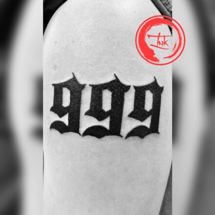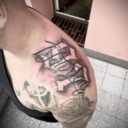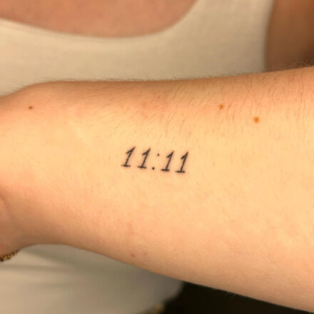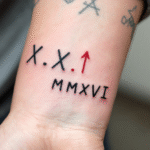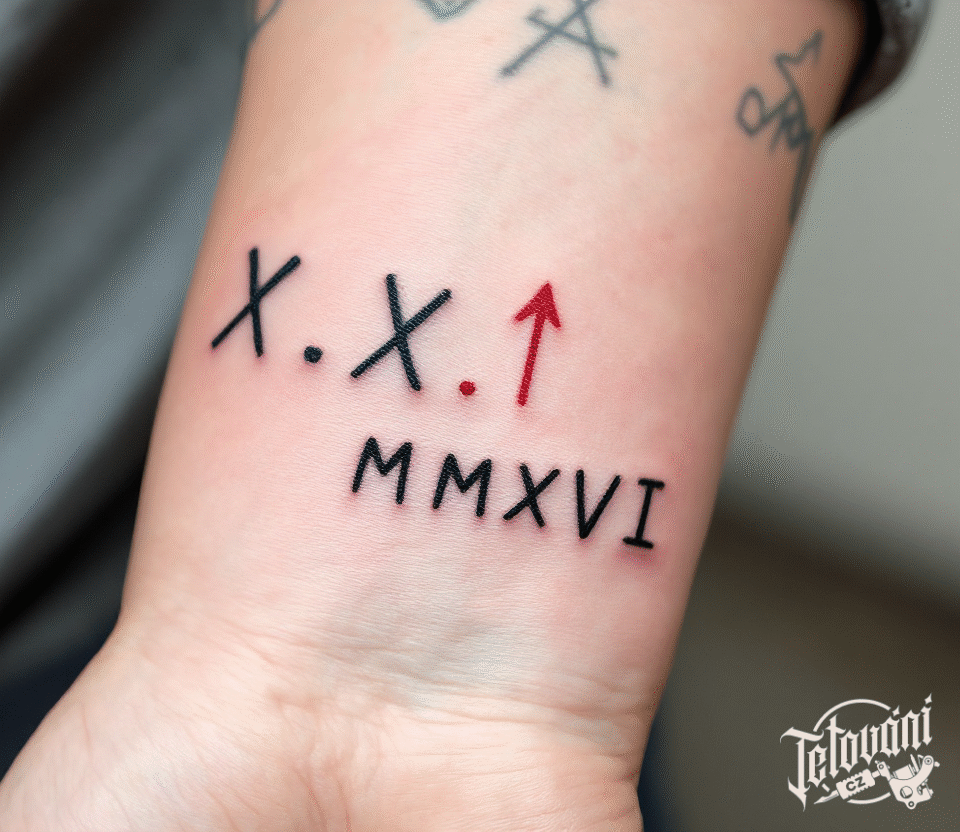 Tetování nápis, římské čísla, písmena, datum, šipka na předloktí