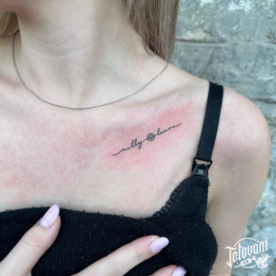 Tetování nápis s květinou pod klíční kostí