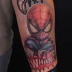 Tetování nápis s postavičkou z filmů a pohádek Spiderman na předloktí