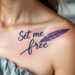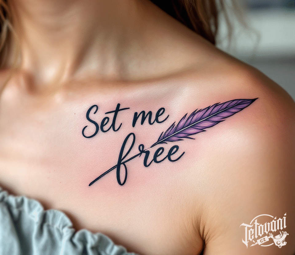 Tetování nápis, symbol svobody, pírko pod klíční kost