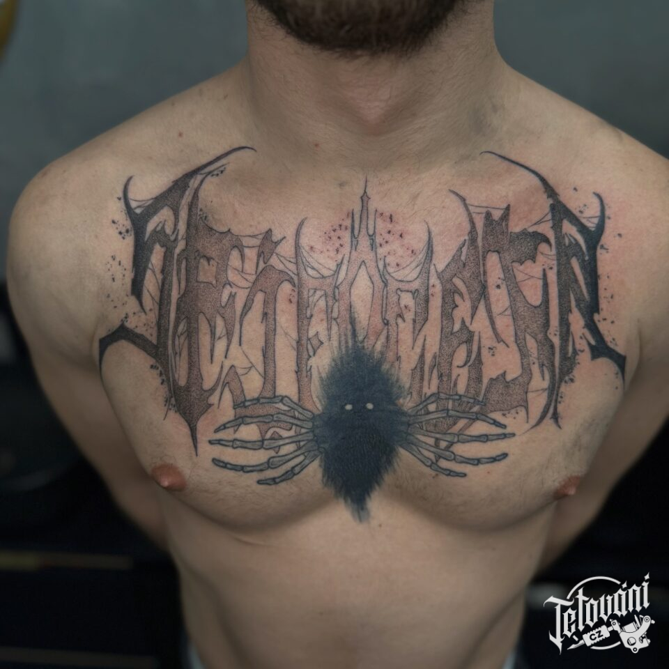 Tetování nápis, zvíře, pavouk a kostry ruce na hrudníku