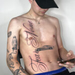Tetování nápisy a dopravní prostředek auto na hrudník