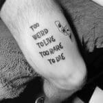 Tetování nápisy a masky na stehně