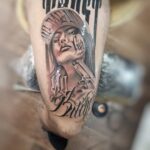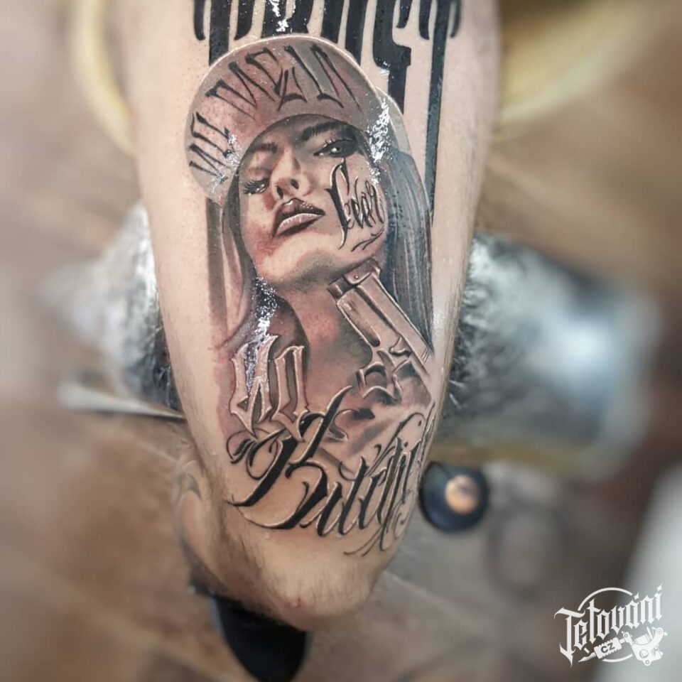 Tetování nápisy a žena na stehno