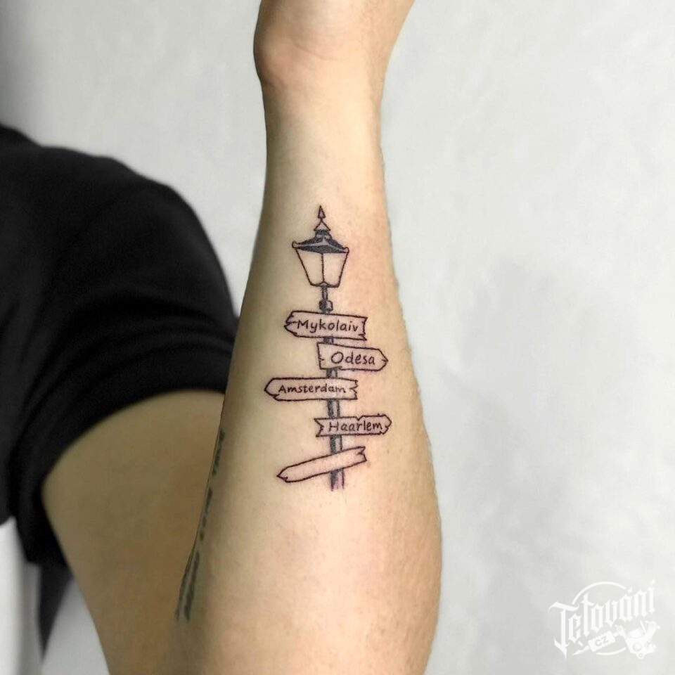 Tetování nápisy a znaky a symboly, cestování na předloktí