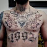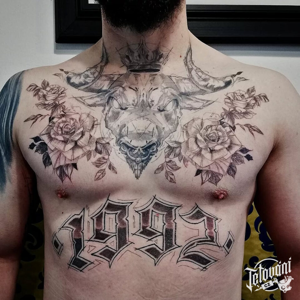 Tetování nápisy, čísla, hlava býka a květiny na hrudník
