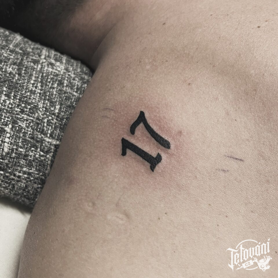 Tetování nápisy, číslice na lopatce
