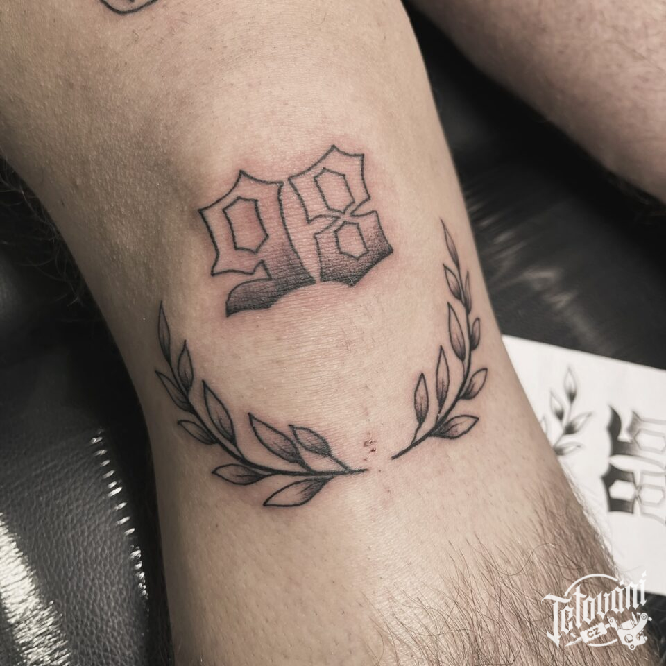 Tetování nápisy, číslice, větvičky na koleni