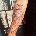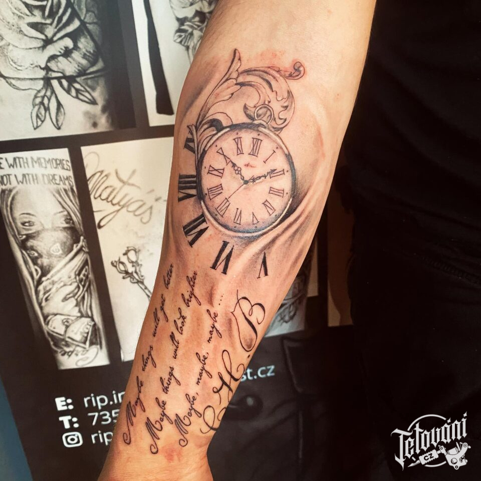 Tetování nápisy, citát a hodiny, hodiny čas na předloktí