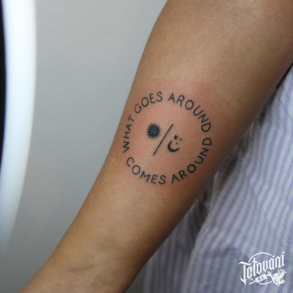 Tetování nápisy, citát a planety, měsíc a slunce na předloktí