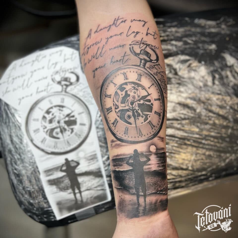 Tetování nápisy, citát, hodiny, hodiny čas a cestování na předloktí