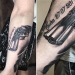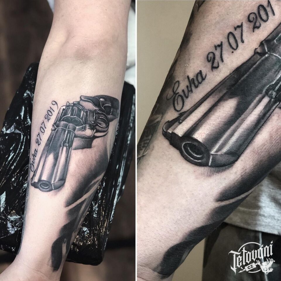 Tetování nápisy, datum, jméno, zbraň na předloktí