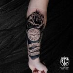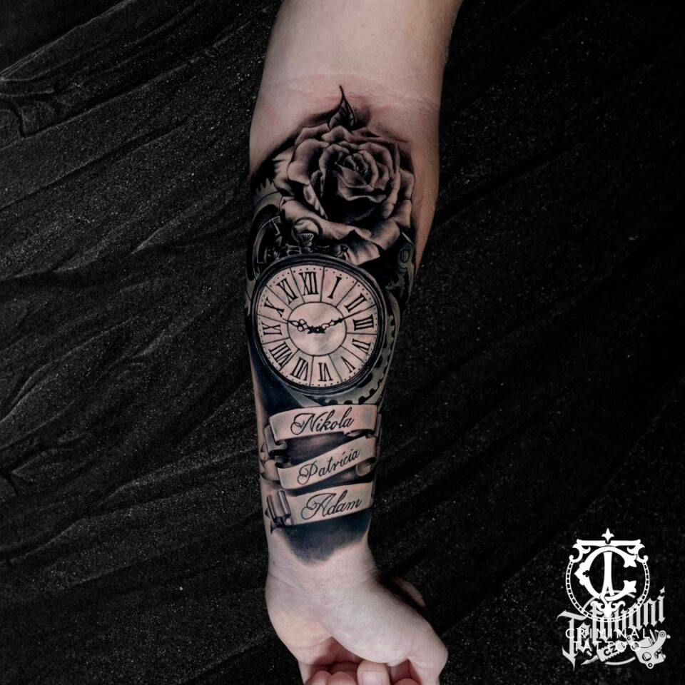Tetování nápisy, jména, hodiny a růže na předloktí