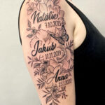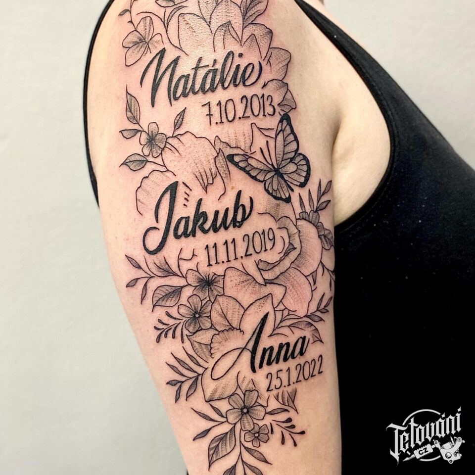 Tetování nápisy, jména s datumy narození a květinami na rameni
