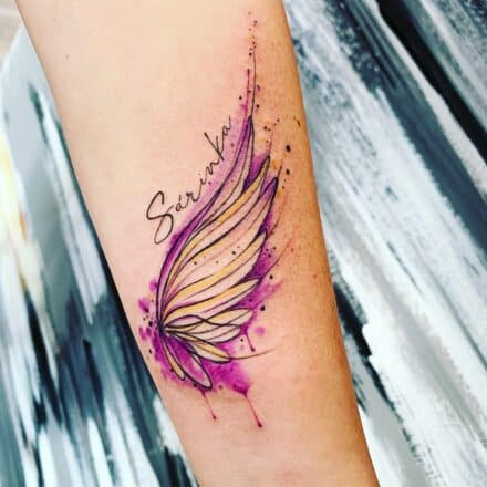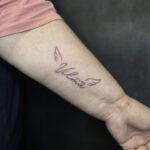 Tetování nápisy, jméno, datum, andělská křídla na předloktí