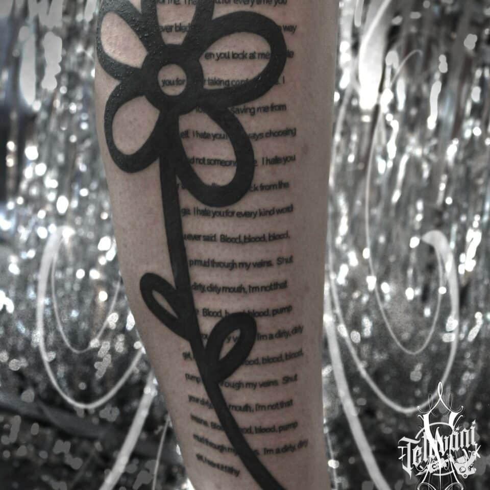 Tetování nápisy, květina na lýtku