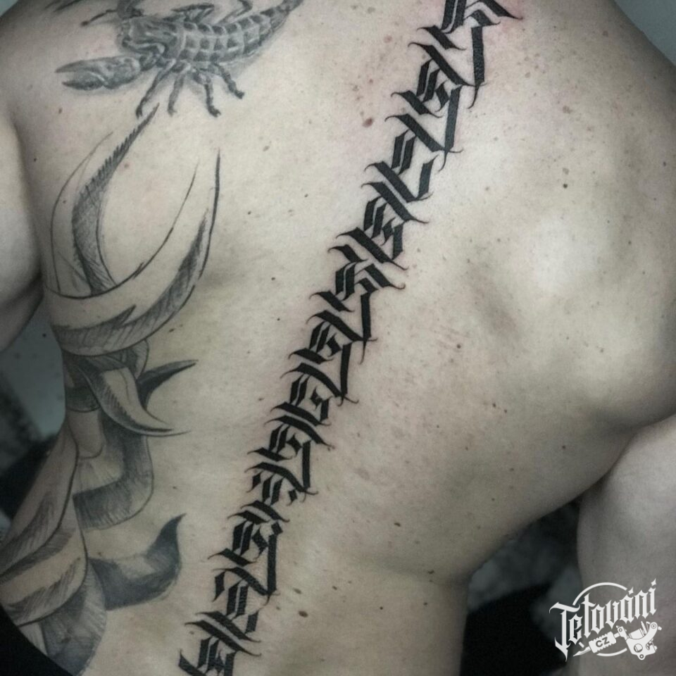 Tetování nápisy, písmena na zádech