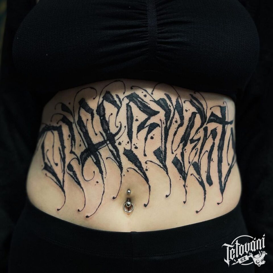 Tetování nápisy, písmena, znaky a symboly na břicho