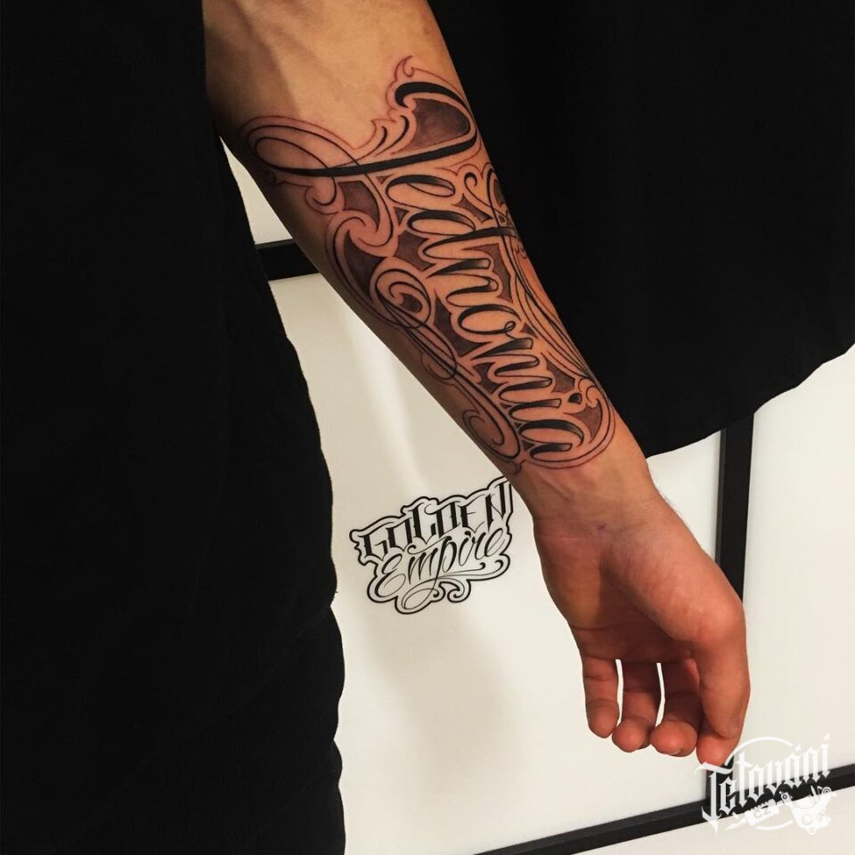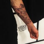 Tetování nápisy, symbol na předloktí