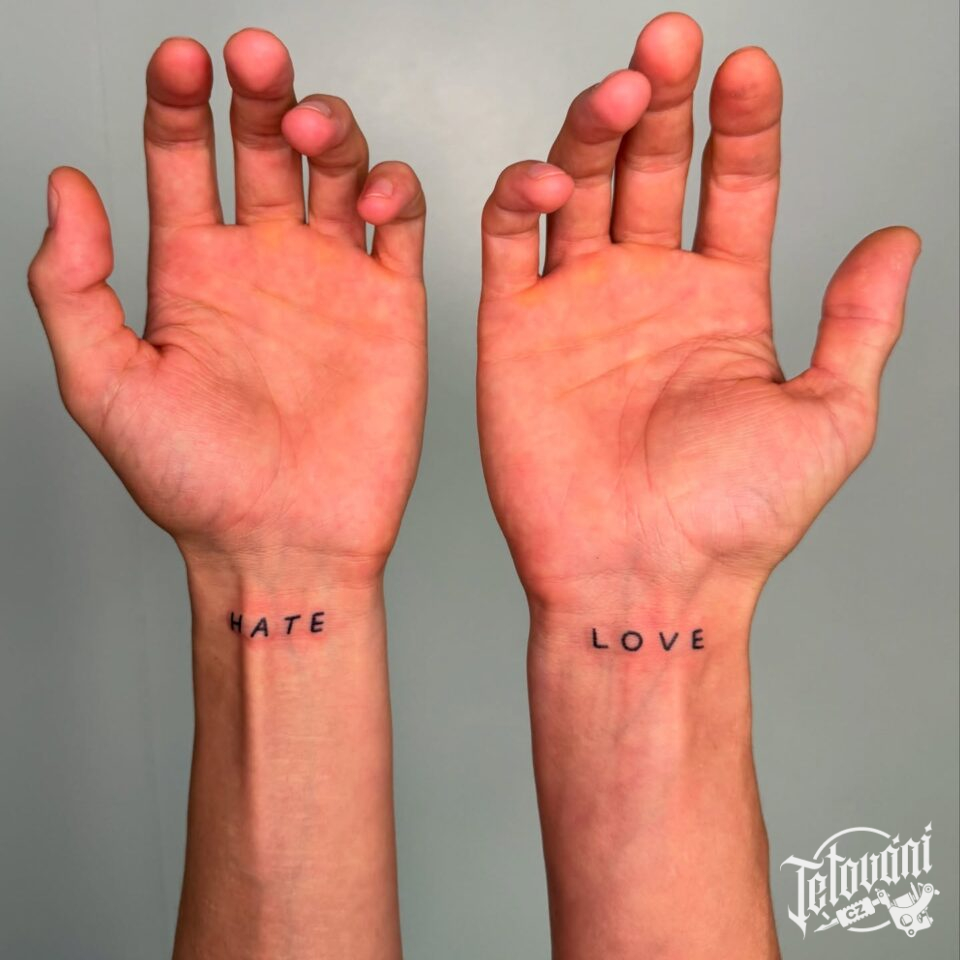 Tetování nápisy, symboly lásky na předloktí,